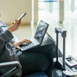 A woman works on her laptop at an airport, representing a perk of having a digital nomad visa.